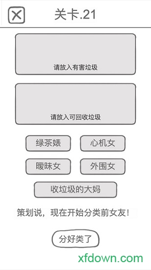 前任是什么垃圾是一款极具创意的休闲益智游戏,它将现代都市情感话题与垃圾分类知识完美融合。游戏以幽默风趣的方式探讨了"前任"这个永恒话题,同时巧妙融入了环保理念。在这个游戏中,玩家需要将各种与前任相关的物品进行准确分类,从日常用品到情感纪念品,每一关都充满惊喜。游戏不仅寓教于乐,还能让玩家在轻松愉快的氛围中掌握垃圾分类技巧,是当下最独特也最具话题性的休闲游戏之一。