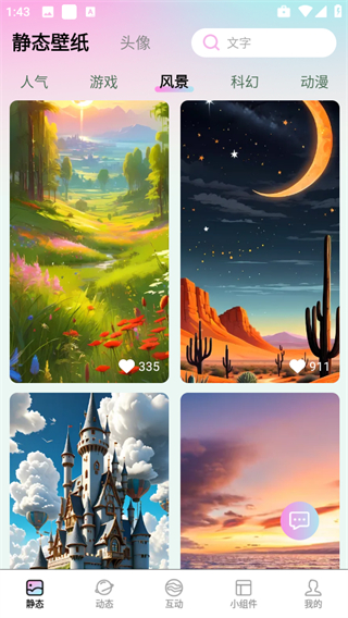 百变壁纸精灵拥有超过十万张静态壁纸资源,涵盖游戏、风景、科幻、动漫、可爱、插画等数十种不同题材。每个题材下都储备了数千张精美壁纸,确保能够满足用户在各种场景下的桌面美化需求。无论是工作、学习还是娱乐场景,都能找到最合适的壁纸来搭配您的心情。