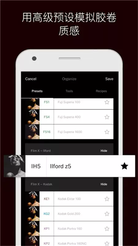 整理页面支持用户自定义预设、工具和配方的展示顺序,可以收藏常用滤镜、隐藏不常用的功能,打造个性化的编辑环境。长按滤镜即可快速收藏,大大提升了工作效率。