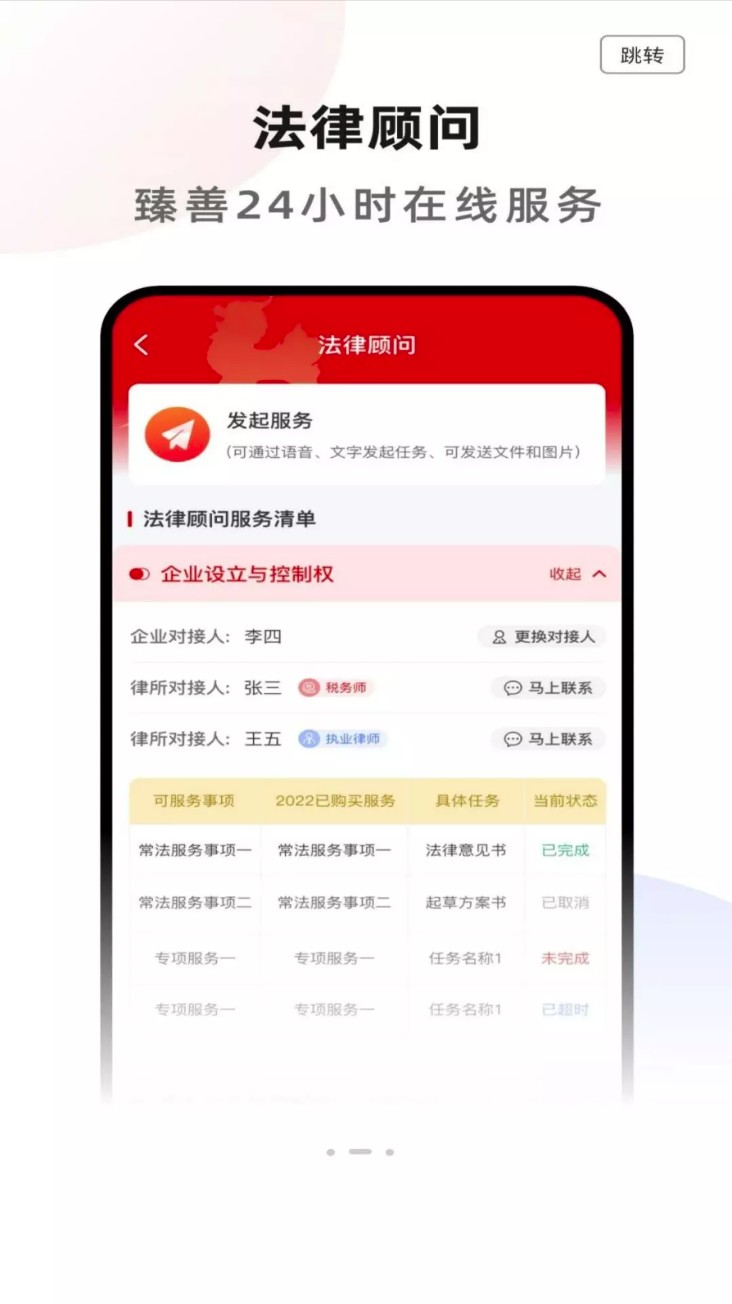 使用臻善法律服务非常简单便捷。打开首页后,用户可以浏览律师在线状态、客服在线情况以及常见法律专题,点击分类即可快速进入相关服务页面。在「企业服务」模块中,用户可以查看法律顾问产品和企业风险管理方案,根据实际需求选择适合的服务套餐。点击底部导航栏中的「免费合同」,可以浏览包括租赁、赠与、劳动、买卖等多种类型的合同模板,方便用户直接下载使用。进入「我的」页面后,用户可以管理订单、合同和文件,查看发票信息,进行个性化设置,还能随时提交服务反馈。