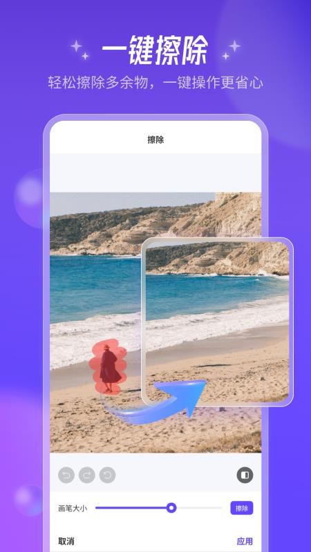 为用户提供了智能擦除功能,可快速去除图片中多余的人物、杂物或瑕疵。通过先进的AI识别技术,能够精准识别需要擦除的区域,保持画面自然完整。无论是旅游照中的路人甲,还是日常照片中的小瑕疵,都能轻松消除。