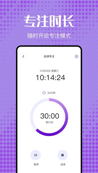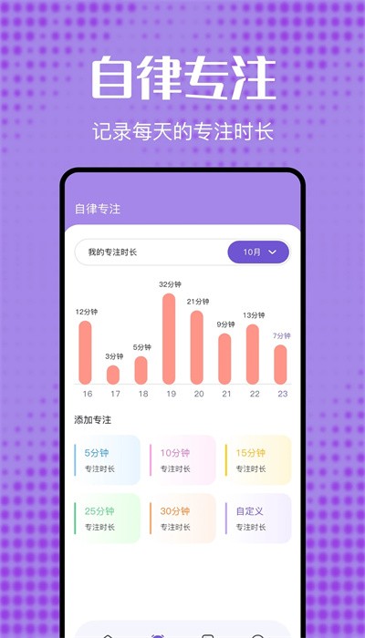 自律专注模块提供了专业的专注时间管理功能。用户可以设置专注时长,系统会自动记录每日的专注情况,帮助培养良好的学习与工作习惯,提升时间管理能力。