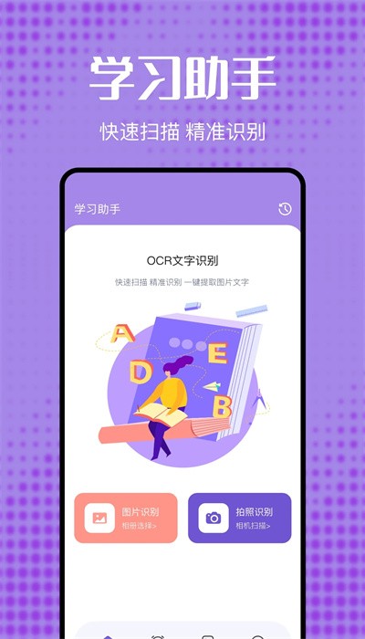 进入学习助手页面后,用户可以选择图片识别或拍照识别功能。通过拍摄书本或资料页面,软件能够快速提取其中的文字内容,高效完成OCR识别过程,为学习资料整理提供极大便利。