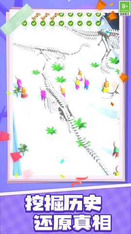 在游戏中,玩家可以体验到最真实的考古发掘过程,亲手挖出埋藏在地下的各种化石,并将这些珍贵的发现组合成完整的恐龙骨架,最终展示在你精心打造的专属博物馆里!游戏提供了广阔的世界地图,玩家可以自由选择想要探索的岛屿,每个岛屿都隐藏着独特的侏罗纪秘密等待揭晓。游戏中共有5种史前恐龙化石需要完成收集,包括令人震撼的霸王龙、威武的三角龙等著名恐龙物种,每完成一个化石的收集都能带来巨大的成就感。
