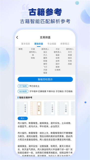 排盘结果可自动关联古籍原文,提供理论依据和解释。这个功能让命理分析更有依据,用户可以直接查看相关古籍的原始记载,加深对命理的理解。
