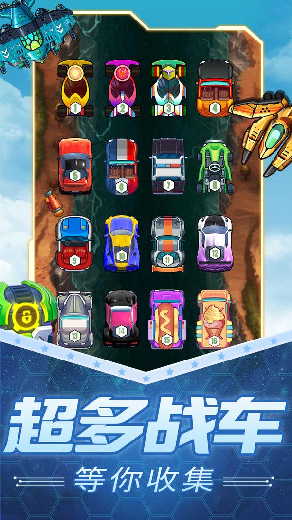 游戏的核心玩法是控制飞行赛车与敌方飞机展开激烈对战。玩家需要灵活操控赛车进行攻击和躲避,同时收集各种强化道具来提升战斗力。游戏提供了多种特殊道具,其中盾牌是最重要的防御装备,能够为玩家提供短暂的无敌时间。最令人兴奋的是合成系统,玩家可以将两辆同级别的飞行赛车合成为更高级别的赛车,比如将两辆8号机合成为雷电9号机,不仅外观焕然一新,各项性能也会得到质的飞跃。