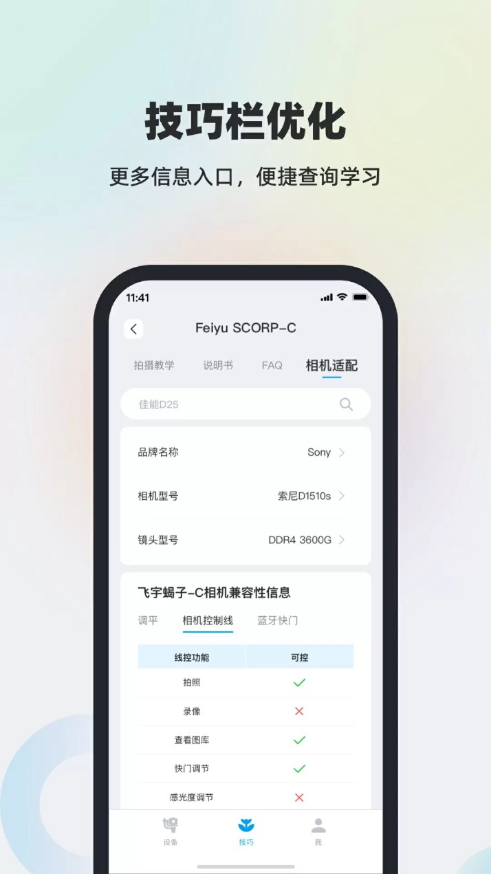 作为一款专业级影像应用,FeiyuSCORPAPP内含详细使用说明、产品说明书等,丰富资讯应有尽有,在这里,还可以查看各类教学视频,激发创作灵感,尽情与优秀视频创作者交手。每周更新的拍摄技巧专栏,由知名摄影师分享实战经验。