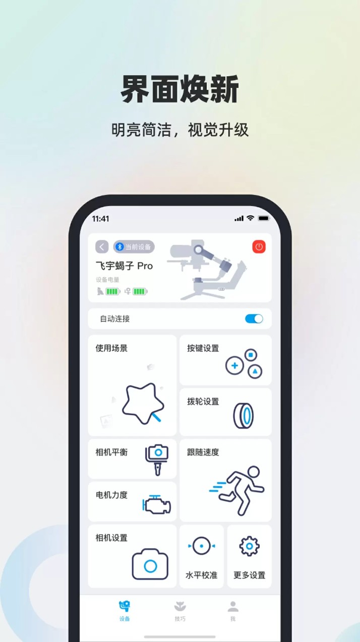 FeiyuSCORPAPP是飞宇科技专为旗下三轴稳定器系列研发的智能控制中枢,采用低功耗蓝牙技术确保连接稳定性,延迟低至50ms。除了基础的云台控制功能外,APP还集成了智能跟随3.0、手势控制等创新功能,支持4K视频参数调节,让专业级影像创作触手可及。用户可通过APP实现固件一键升级,持续获得最新功能体验。