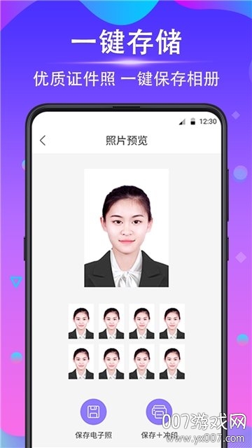 智能人脸美化:采用先进的人脸识别技术,不仅能保证照片的高清画质,还能智能修饰面部瑕疵,让您的证件照更加完美。一键美颜功能让您轻松拥有自然得体的证件照。