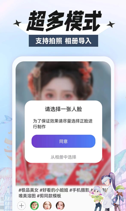 专业人脸识别技术实现精准换脸,满足各类创意需求。无论是影视角色扮演还是趣味变装,都能轻松实现。海量主题模板持续更新,涵盖民族风、古风、现代潮流等多种风格,总有一款适合你。