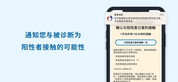 通过蓝牙信号交互,应用会记录附近其他设备的接触情况。当用户间保持1米内距离超过15分钟时,若其中一方后续确诊并登记,另一方将收到匿名提醒。