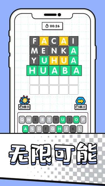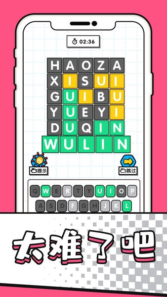 非常有新意的休闲益智类手机游戏,字谜模拟器安卓版这个游戏中,玩家可以根据不同的字母提示来进行挑战,你要在规定的时间内完成字谜任务,将所有的字母拼凑成完整的拼音。
