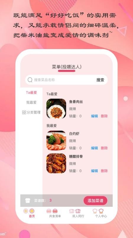 「发现菜谱」板块汇集红烧肉、酸菜鱼等经典家常菜,为情侣提供美食灵感;支持情侣分别创建"投喂菜单""干饭菜单",可编辑菜品口味、销量,还能一键下单,从选菜到干饭全程互动,让做饭、干饭不再是一个人的事。