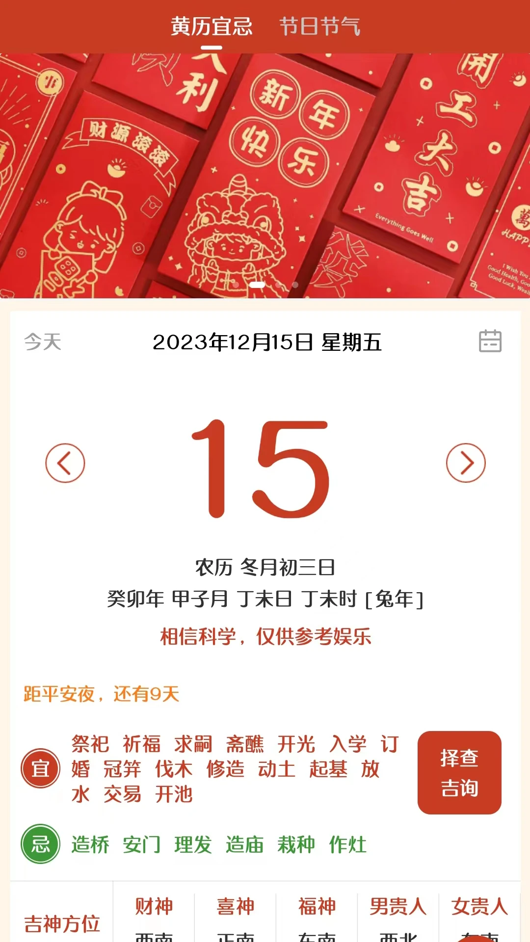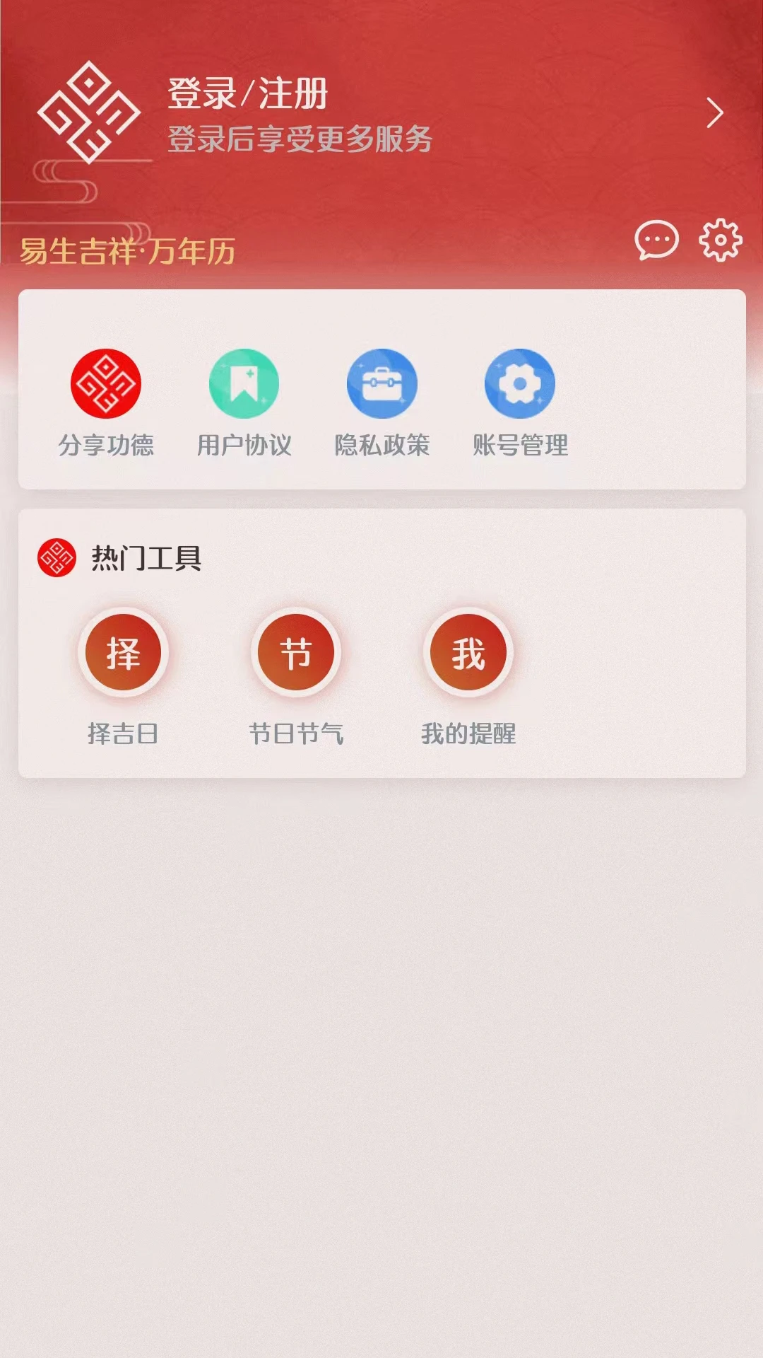 易生吉祥万年历APP是一款融合传统文化与现代科技的实用工具,专为用户提供精准的日历查询、运势分析和人生规划服务。它不仅继承了中华传统万年历的精华,还结合现代科学算法,为用户打造专属的时间能量日历。无论是查看每日宜忌、运势走向,还是科学规划生活,易生吉祥万年历都能为您提供专业参考,助您把握每一天的能量场,让生活更加有序、吉祥。