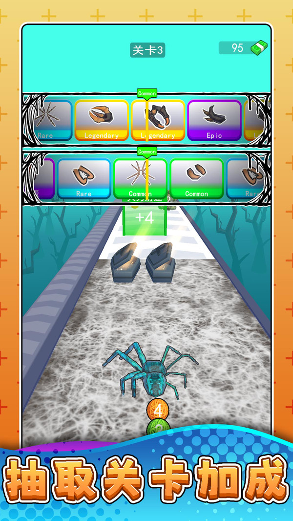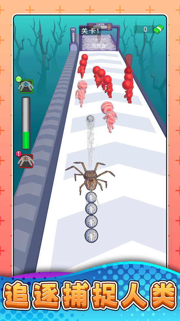 角色进化:比比谁更快中蜘蛛可通过收集发光飞虫不断成长,从外观到能力全面提升,每一次蜕变都让玩家体验到明显变化和成长成就感。
