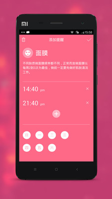 【护肤提醒】每日准点提醒你护肤,不能偷懒;系统会根据不同肤质推荐最适合的护肤时间,让每一道护肤程序都能发挥最大功效。用户还可以自定义护肤步骤,打造专属的美容方案。