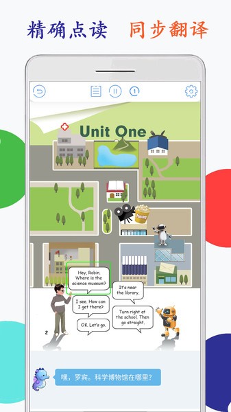 1:所有课文均配有专业外教录制的标准朗读音频,发音纯正清晰,支持逐句跟读和录音对比功能,有效培养小朋友的英语语感和朗读水平。系统还会根据朗读准确度给出评分和建议,帮助学生不断改进发音。