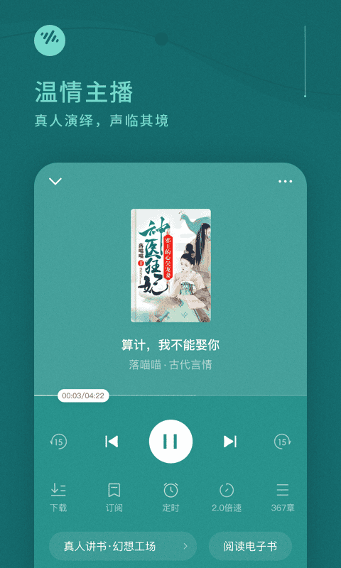 点击播放按钮即可享受专业播音员的真人声音演绎,支持倍速播放、定时关闭等实用功能,提升收听体验。