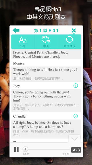 双语剧本切换。提供英文原版和中英文对照两种显示模式,方便用户随时切换,满足不同学习阶段的需求。