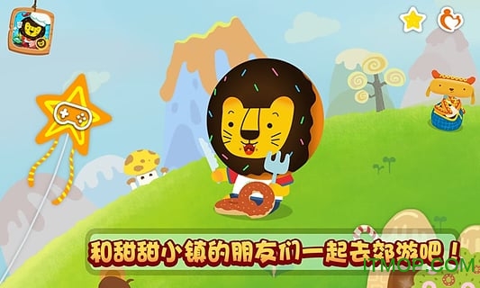 在梦幻的甜甜小镇,所有建筑和物品都由美味食材构成:糖果屋顶的教室、饼干铺就的小路,就连云朵都是棉花糖做的。小狮子多纳作为向导,将带领孩子结识7位性格鲜明的伙伴——总是抱着果冻罐的粉红大象、戴着厨师帽的汉堡猫等。每个角色都有专属的饮食偏好和趣味故事线,比如热狗狗最爱藏在面包隧道里玩捉迷藏。这些设定不仅能培养孩子的观察力,更能通过"猜猜谁爱吃什么"等互动环节强化记忆点。