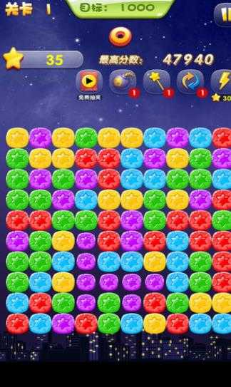 基本消除规则:玩家需要通过点击或滑动屏幕,将三个或更多相同颜色的星星连在一起进行消除。每次消除都会获得分数,消除的星星越多,获得的分数越高。游戏还引入了连锁反应机制,当一次消除引发后续消除时,可获得额外加分。