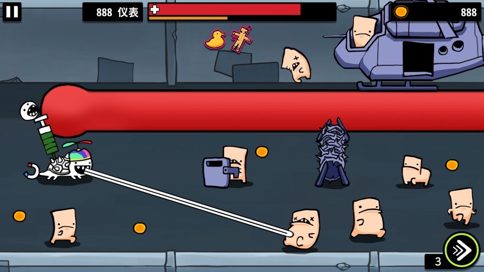 这是一款十分有趣夸张的跑酷类游戏,为了逃出实验室,这个外表可怖的怪物开始了屠杀,吃掉眼前的人们进行各种进化。游戏最令人称道的是其丰富的进化系统,每种进化都会显著改变游戏体验。比如选择防御路线,你的角色会逐渐变成刀枪不入的钢铁巨兽;而选择敏捷路线,则可以解锁二段跳、瞬移等炫酷技能。关卡设计也充满创意,从生化实验室到军事基地,每个场景都有独特的机关和敌人配置。游戏还设置了丰富的成就系统和隐藏进化,鼓励玩家反复挑战。这款游戏成功地将血腥暴力转化为卡通式的欢乐体验,堪称跑酷游戏中的另类佳作。