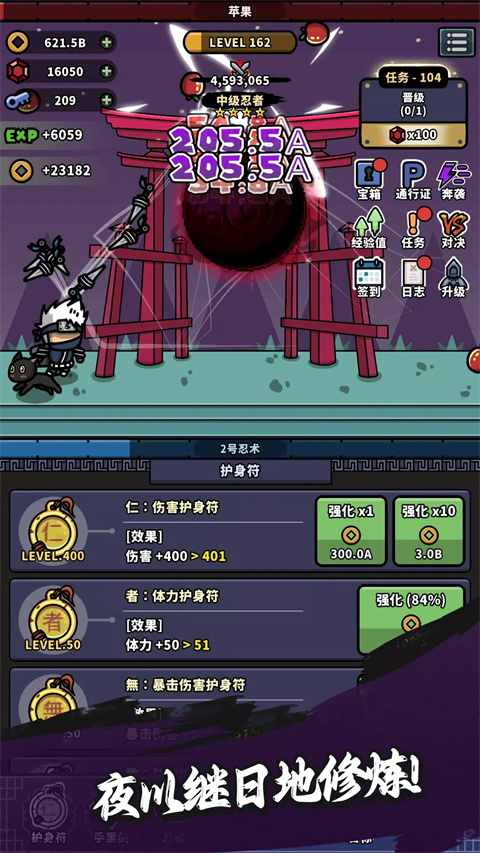 热血忍者是一款融合了日式忍者文化与现代放置玩法的休闲养成手游。在这个充满东方韵味的忍者世界中,玩家将扮演一位忍者导师,通过独特的修炼系统培养属于自己的忍者军团。游戏采用精致的2D手绘风格,从樱花飘落的庭院到灯火通明的忍村,每个场景都完美还原了传统日式美学。创新的挂机机制让玩家即使离线也能持续获得收益,而丰富的忍者收集系统则提供了上百种个性鲜明的角色,从傲娇的忍猫到冷酷的暗部精英,每个角色都拥有专属的成长故事和技能体系。