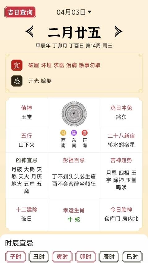 软件提供完整的黄历信息查询功能,包括每日宜忌、冲煞方位、吉神方位等传统黄历内容。用户可以查看详细的时辰吉凶分析,了解每个时辰适合进行的活动类型。系统还会根据传统算法自动标注今日特别适宜或忌讳的事项,为用户提供专业的择日参考。所有信息都经过权威专家审核,确保内容的准确性和可靠性。