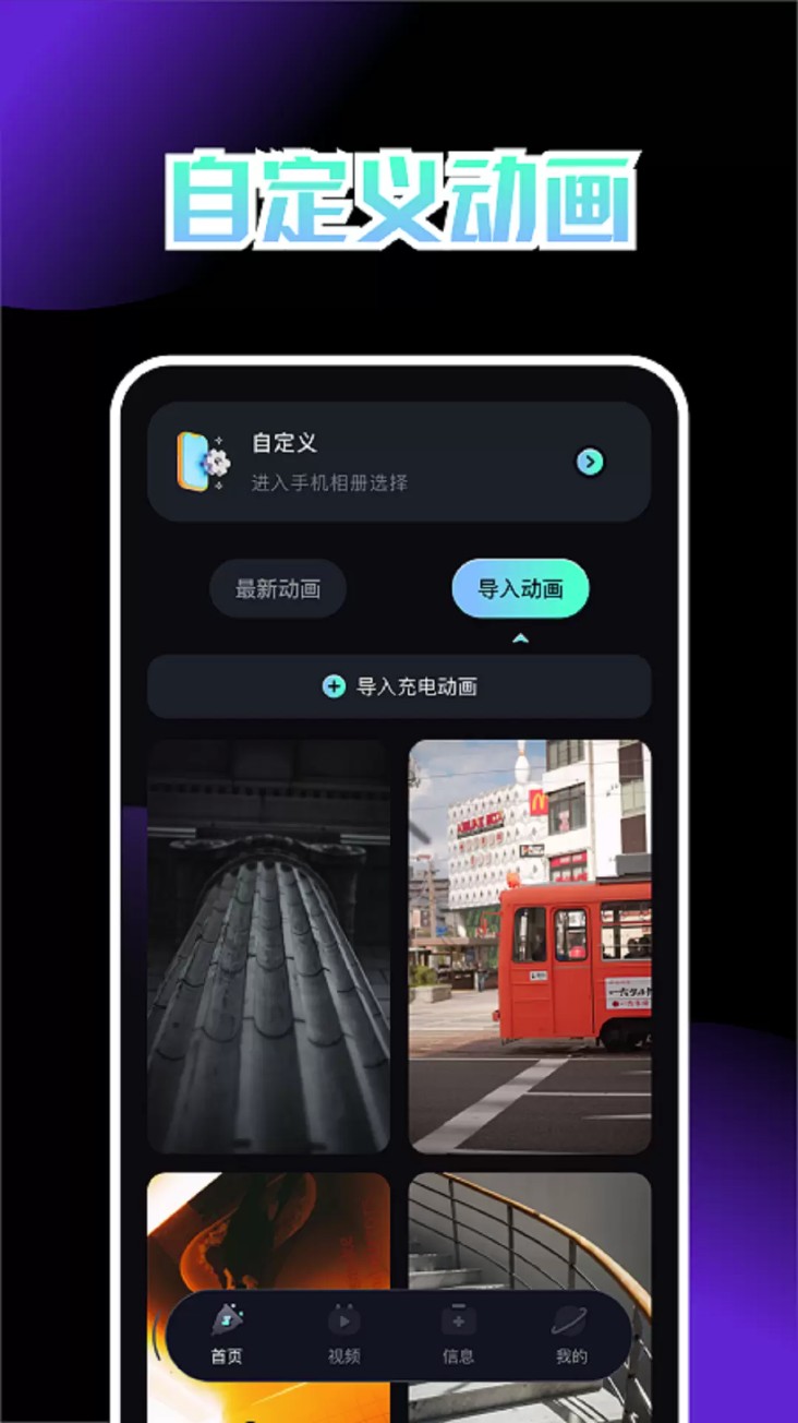 在首页点击上方「自定义」区域,即可进入手机相册页面,自由选择本地视频设为充电动画。支持多种视频格式,最长可设置30秒动画片段。