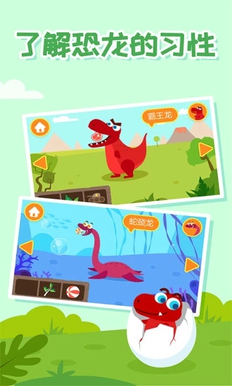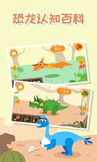 游戏内置丰富的恐龙百科知识库,包含上百种恐龙的信息。通过图文并茂的方式介绍每种恐龙的外形特征、生活习性、生存年代等知识,帮助孩子建立系统的古生物认知。