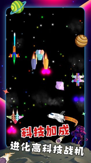 《太空英雄战机》最大的特色在于其紧张刺激的生存挑战。玩家只有一架战机,一旦被击毁游戏就会结束,这要求你必须时刻保持警惕。游戏不仅考验你的走位技巧,还需要你合理运用各种武器系统来对抗敌人。随着游戏的深入,你将解锁更多强力武器和特殊技能。游戏还设计了丰富的敌人类型和弹幕模式,让你在挑战中不断提升自己的战斗技巧。每一次胜利都来之不易,但正是这种成就感让游戏更具吸引力。