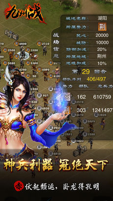 《三国志之九州战》是一款以三国时代为背景的精品SLG策略战争手游,完美还原了那个群雄逐鹿、烽火连天的历史时期。游戏不仅拥有精美的画面和细腻的场景设计,更将三国时期的经典战役和著名武将栩栩如生地呈现在玩家面前。在这里,玩家可以体验到十万大军同屏作战的震撼场面,感受运筹帷幄、决胜千里的战略乐趣。