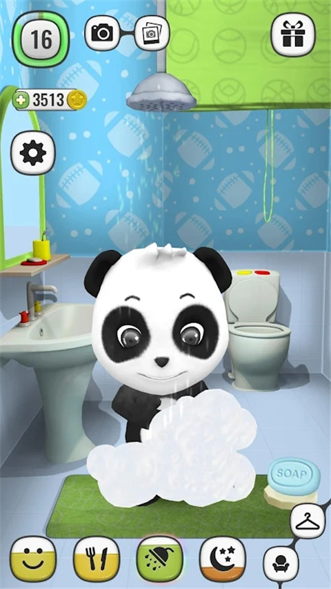 如果你看到他很脏,你必须洗澡他。洗澡环节设计了丰富的互动细节,包括打泡泡、冲水等步骤,熊猫会有不同的反应。
