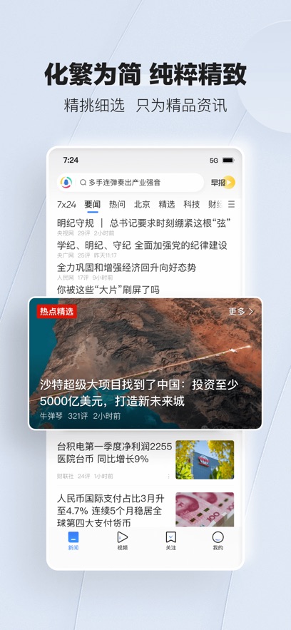 视频新闻:集成短视频新闻功能,支持横竖屏切换和清晰度调节,满足用户多样化的内容消费需求。