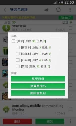 采用行业领先的扫描算法,可在秒级完成全盘APK检索。支持按下载时间、文件大小、名称首字母等多维度智能搜索,内置重复包识别引擎可自动筛选冗余安装包。用户可批量执行删除/安装操作,独有的版本比对功能还能智能识别旧版本安装包,帮助您高效释放存储空间,让应用管理变得简单直观。