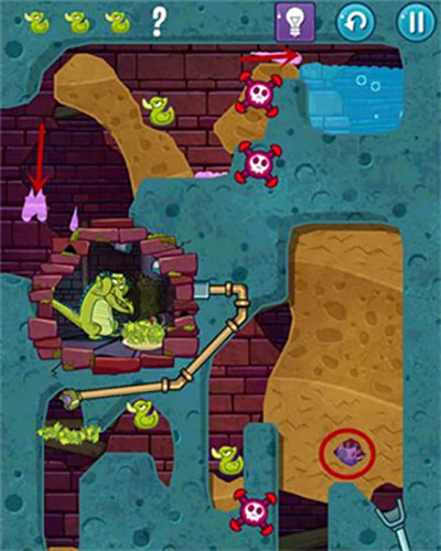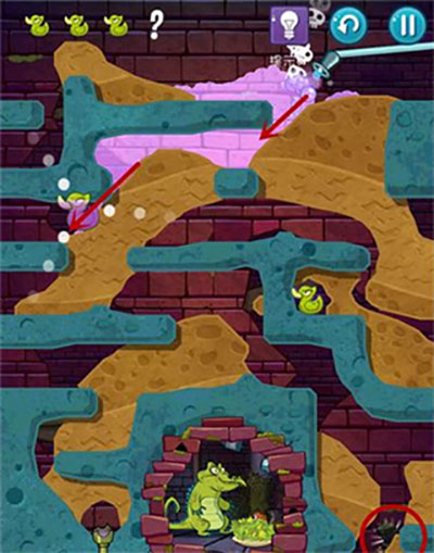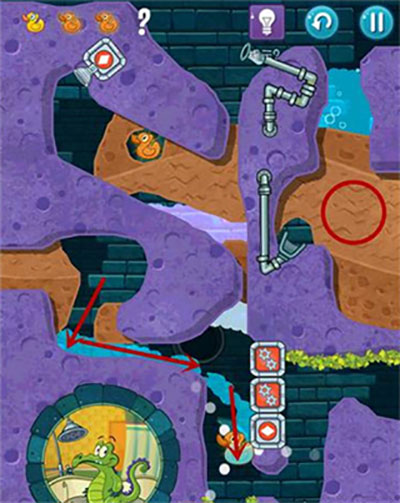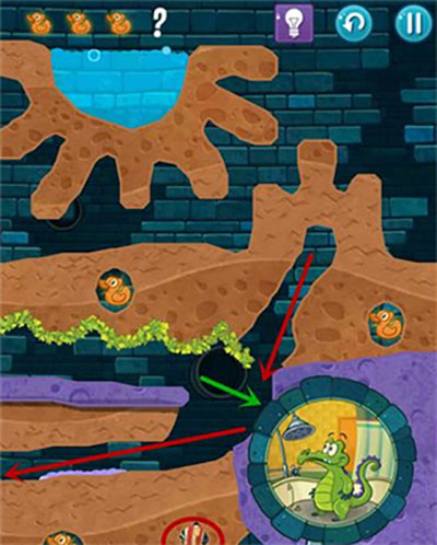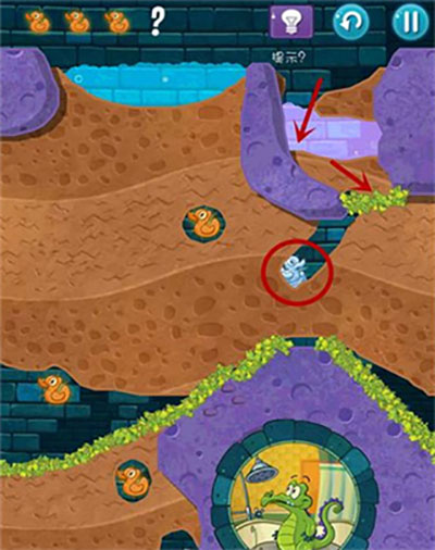 2、本关首先在通向上面一只鸭子处划开道路,打开红色水闸开关。然后泥浆碰见青草变为石头;