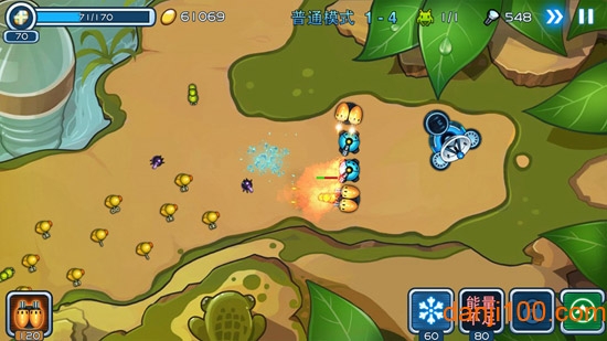 虽然这是款以战斗为主题的塔防游戏,但是该游戏的整体给人的感觉确实非常小清新的,战斗画面干净,页面设计简洁,这些都能为玩家提供一个非常好的游戏氛围!只不过小编觉得里面的敌人即形态各异的昆虫体型似乎有些过小了,即便为了迎合小小防御战这样的游戏名和出于大视角的方向考虑,但若稍大一些的话相信也未尝不可啊!游戏的光影效果处理得当,爆炸特效和技能动画都相当精致,为战斗增添了不少视觉冲击力。