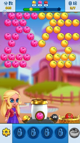 移动瞄准同色的水果射击。玩家需要仔细观察泡泡的颜色分布,瞄准相同颜色的泡泡进行射击,以形成连续的消除效果。