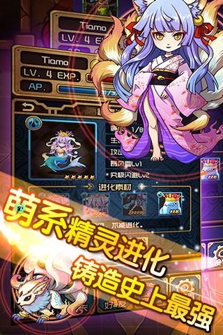《精灵X探险》游戏风格紧贴当前日系风格,各种精灵怪物都让人萌出鼻血。不光是天使、恶魔、精灵妹子会被你征服,各种特殊的“人外娘”也会给你特殊的游戏体验,九尾狐、人马、美杜莎等等另类萌物也会为你而战。游戏中还加入了精灵进化系统,玩家可以通过培养让精灵不断成长,最终进化为强大的终极形态,成为战斗中的核心力量。