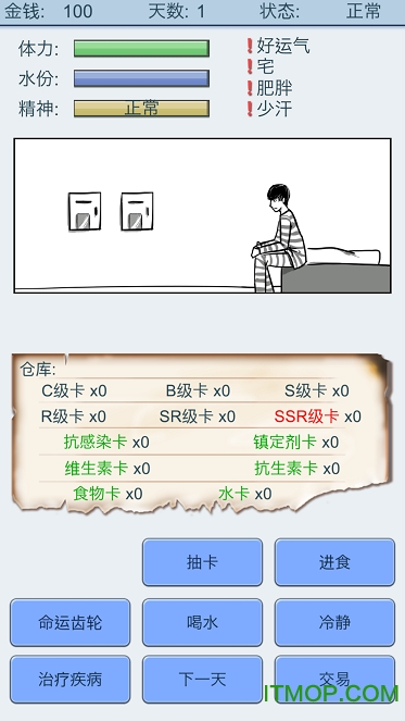新手玩家需要注意,精神值管理至关重要,当精神值降至五分之一时就要格外小心。食物和水资源非常容易消耗殆尽,建议多囤积食物卡、水卡和镇静剂。对于医疗类卡牌,保留适量即可,多余的可选择在价格合适时出售。