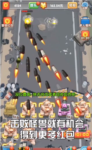 轰你一炮红包版是一款充满趣味性和挑战性的休闲射击游戏,玩家通过操控大炮不断射击怪物来获取金币和红包奖励。游戏的核心玩法简单易上手,但想要在战斗中取得优势,必须不断提升坦克属性,这样才能击败一波又一波来袭的怪物。在激烈的射击过程中,玩家积累的金币可以直接兑换成红包,并且支持真实提现,让娱乐与收益完美结合,这正是轰你一炮红包版最吸引人的特色之一。
