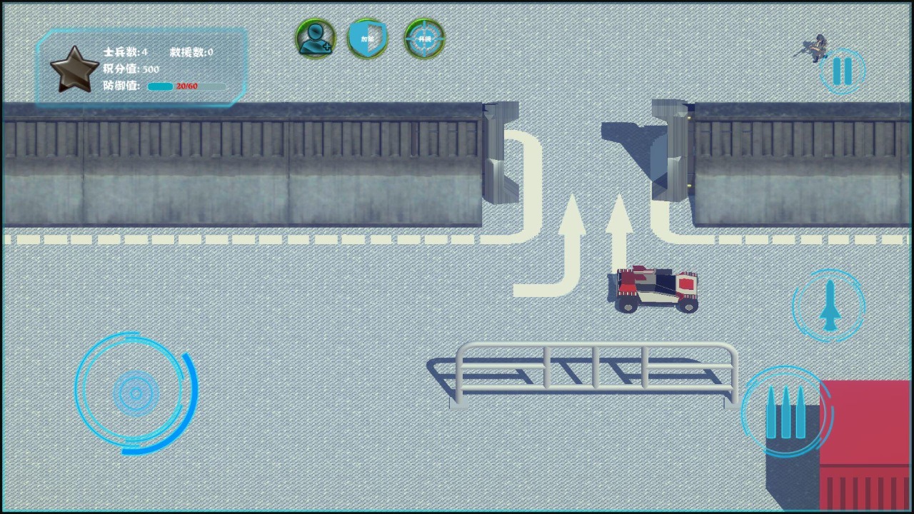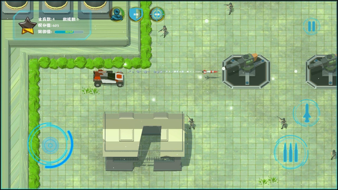 操作介绍:左手操作遥感,控制吉普车行走方向。右手操控机枪和导弹,与地方作战。建议将灵敏度调至中等偏上,这样既能保证精准射击,又能快速应对突发状况。熟练使用导弹的抛物线特性可以打击掩体后的敌人,这是速通高手的必备技巧。