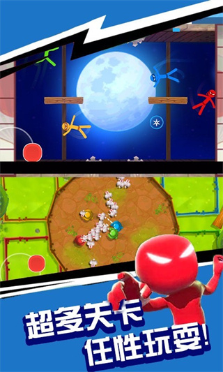 多彩:红、黄、蓝、绿多种角色选择自定义你的战斗风格。除了基础颜色外,游戏还提供丰富的服装和配饰系统,玩家可以打造独一无二的火柴人形象。不同颜色的角色还附带特殊属性加成,让战斗更具策略性。