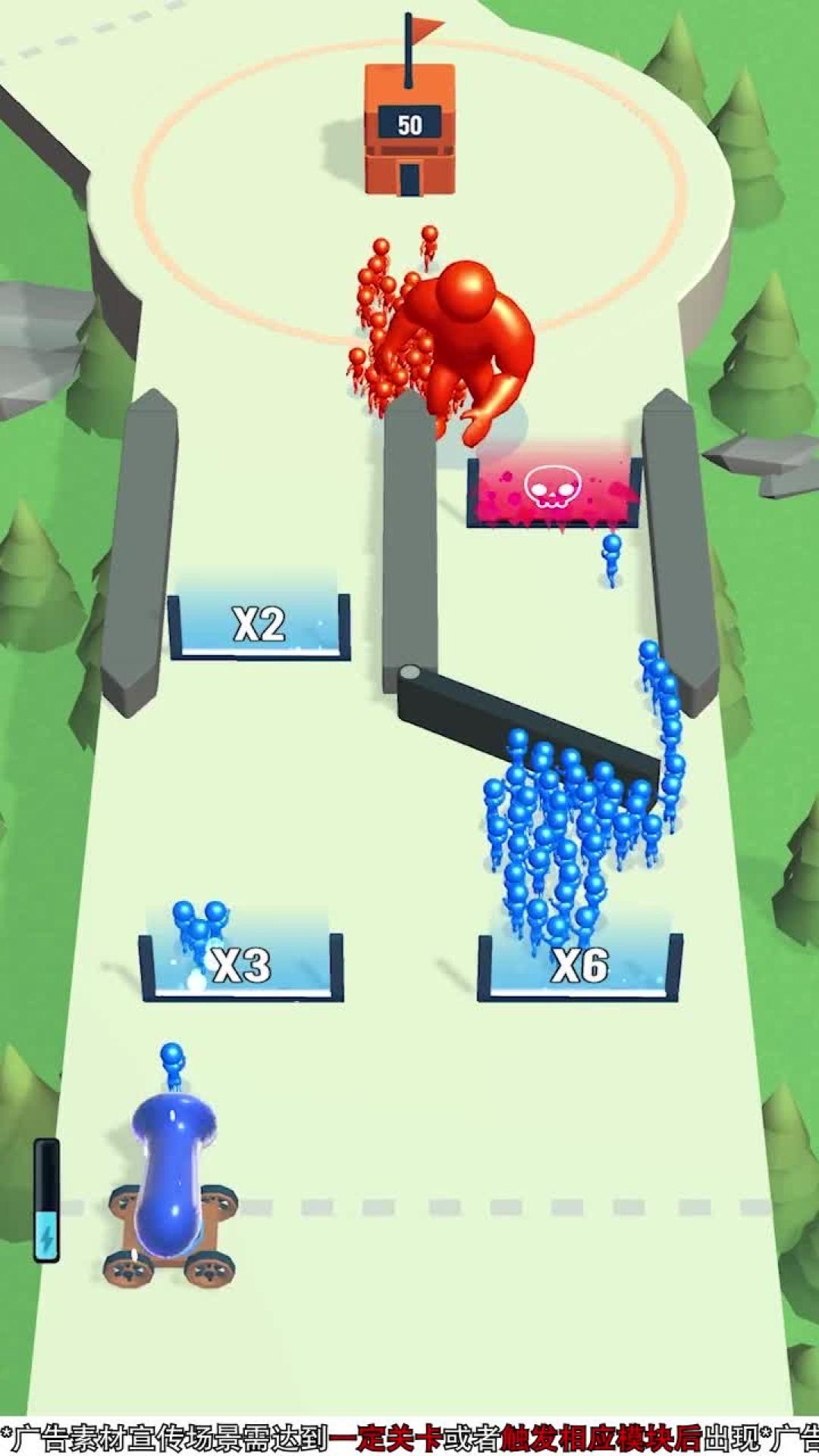 用你的大炮连续发射小兵,助你战斗,击破敌人的所有防御工事。游戏操作简单直观,但需要玩家掌握精准的发射时机。将人们带到倍增的大门上,以增加您的人群并占领所有基地!倍增门是快速扩充兵力的关键,但要注意分辨门的作用。避开红色大门,然后推开红色人群,试图破坏您的进攻节奏。你可以聚集多少人?这完全取决于你的战术选择和操作水平。